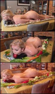 Naked and kneeling obediently on the table Missy's commanded to lay flat on her front as her Master positions half-pipes beneath her head and hips, arching her body into a perfect display. Head lifted high, juicy ass thrust upward, vulnerable and exposed. He begins drizzling warm oil across her trembling skin, slicking down her curves, but she cries out in protest. A shiny red apple is crammed into her mouth, gagging her into total silence and compliance.