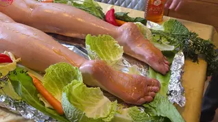 Finally, the heat cranks up. Missy sizzles and steams under the intense warmth, her body glistening with the oil-honey glaze as steam rises from her arched form. Closeups capture her steaming ass, succulent toes and wide eyes pleading above the bright red apple gag. A few hours to slow cook and this rump will be ready to serve.
