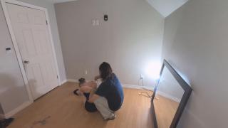 I take her into the room with her hands securely tied behind her back. We then take her down to the ground and tie her ankles and knees above and below her elbows, shove a couple socks in her mouth and tape them in place and hogtie her