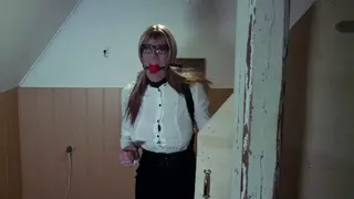 At home of Mr Lloyd: While the man is absence for work, his house-help Chrissina, a proper-courvatious Maid in a cute uniform, is busy with cleaning up his flat. After all work is done, the busty gurl think about her next activity and decides to find out about Mr Lloyd's secret up on his attic where he sometimes vanishes with female visit. While Chrissina snoops arround in a tiny room, she finds a closet packed-up full with different BDSM-toys and is totally shocked about this unexpected discovery. Curious aboout all this stuff, Chrissina uses the time for a personal try... unfortunatelly right in that time as Mr Lloyd enters the room. Equipped with a big ballgag the bold snoop try to expalin the situation but her boss has still decided to give her a proper sample of his hobby as lesson. Additionally to her still wearing ballgag, the big-boobed Bimbo becomes brutally tied-up into a frogtie and got left alone for a while.