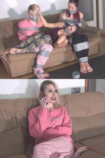 由纪子今天心情有点小坏,她想要被捆绑。于是她打电话给她的女王西比拉。“快来把我绑起来!”西比拉没有让她久等!由纪子还想让西比拉用她的内裤和胶带堵住嘴。于是西比拉先用胶带把由纪子绑了起来,然后用由纪子的内裤和胶带堵住了她的嘴。接着她也用由纪子的内裤堵住了自己的嘴。现在是玩耍和享受的时候了!她们很享受这种感觉,女孩们玩得很开心。西比拉拥抱着由纪子,由纪子也很享受!但这时娜拉来了!她是由纪子的室友,对这一切一无所知。“你们到底在干什么?!”女孩们试图安抚她。西比拉解开了由纪子嘴里的胶带,并向娜拉解释了情况。 “哦!你应该早点说的!我喜欢被绑起来堵嘴,我可以加入吗?”女孩们都惊呆了!雪子看着娜拉也被用内裤绑起来堵住了嘴。西比拉也再次堵住了雪子的嘴。现在两个女孩都被绑起来堵住了嘴,西比拉的嘴也被堵住了。游戏时间到!西比拉拍打她们的屁股,拥抱她们,亲吻她们……充满了爱!女孩们正在举行一场胶带派对! Yukiko is feeling naughty today, she needs some bondage. So she calls her dominatrix, Sibyl. “Please come and tie me up!”. Sibyl dosen't keep her waiting! Yukiko also wants Sibyl to be gagged with her panties and tape. So first Sibyl ties Yukiko up with tape, then she gags her with some Yukiko's panties and tape. Then she gags herself also with more Yukiko's panties. Now is time to play and give love! They love the situation, the girls are having a great time. Sibyl hugs and cuddles Yukiko, and she loves it! But then Nala arrives! She's Yukiko's roomate and she didn't know anything about this. “What the hell are you doing?!”. The girls try to calm her down. Sibyl ungags Yukiko, and she explains the situation to Nala. “Ohhhh! You should've said that before! I love to be tied up and gagged, can I join you?”. The girls are surprised! Yukiko watches how Nala is also tied up and gagged with her panties. Sibyl also gags Yukiko again. Now the two girls are tied up and gagged, Sibyl is gagged too. Time to play! Sibyl spanks them, hugs them, cuddles them.... So much love! The girls are having a duct tape party!