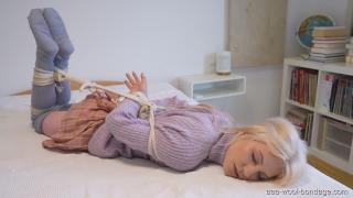 艾米丽对她可爱的大学女生装扮充满自信:“被人关注的感觉真好。”高领毛衣和迷你裙超级可爱,艾米丽喜欢搭配同色系的紧身裤,天气冷的时候还会穿上过膝袜。艾米丽向我们展示了她最喜欢的一套衣服。然后我们问她是否愿意被绑起来,她回答说:“当然,为什么不呢?听起来很刺激,也很有意思。” 艾米丽是捆绑新手,她之前尝试过一些捆绑游戏,但从未用过绳子,也从未被捆绑过,而这次是她第一次被堵嘴!Emily feels confident in her cute collgegirl outftit: “It's good to be noticed”. Turtlenecks and miniskirts are super cute and Emily likes to wear tights that go with them and overknee socks when it gets colder. Emily shows us one of her favorite outfits. And then we asked her if she would like to be tied up in the clothes and she said: “Sure, why not. That sounds exciting and kind of thrilling.” Bondage Rookie Emily has tried a bit of bondage but never with ropes, never in a hogtie before and this is her very first time being gagged!