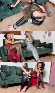 Alice struggles for five minutes and tries in vain to free herself. When the timer rings again, Alice can be heard whimpering desperately. It's time for the final stage of the challenge. Now Mayla completely mummifies Alice with duct tape from her ankles to her shoulders. She can't stop groping and spanking her. Once the mummification is complete, Mayla refrains from starting the timer, because she has decided: either Alice manages to free herself, or she will remain her toy for a long time...