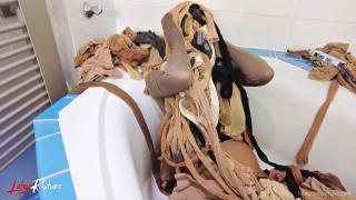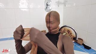 I recently made a nylon dream come true. Because I love nylon so much, I have never thrown away a pair of stockings or tights with runs or tears. I've always collected them. Over the time, this has accumulated into a huge mountain. My entire nylon history! I dumped this nylon mountain into my bathtub and took a fullbody encasement nylon bath. What a feeling. Total nylon overflow. Of course I had to pull as much nylon out of the bath as possible over my body. I think I had 6 stocking masks over my head.