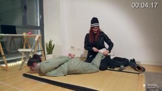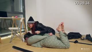 Zenda Sexy is a very good student. She’s finishing some homework in her desk when an intruder comes in. Margout Darko jumps into Zenda from behind and covers her mouth with the hand. Zenda is very scared and confused. Margout reveals she’s a rich bully from school and loves tormenting nerds lives so she will bully Zenda into submission. First ties Zenda’s hands in the back with zip ties. Then gags Zenda with socks and tapes her mouth with grey duct tape. Then Margout ties Zenda in hogtie with more zip ties. Margout sprays Zenda like a dog in an attempt of training her. Then starts to take shots of her with the phone for blackmailing. Later, does bastinado in her feet with a stick and spanks her big butt. Then Margout gets an electric toothbrush and starts to tickle Zenda’s bare feet. Zenda who is very ticklish can’t stop laughing.