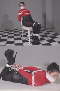 第一部分,她被白色绳索绑在椅子上,嘴巴也被塞住。然后她被放到地板上,五花大绑地绑在床垫上。Sapphire is wearing a tight red turtleneck sweater, a leather skirt, black tights and Heels.
