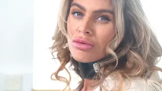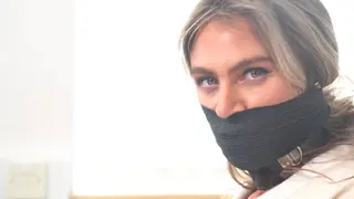 Charlotte loves the new straitjacket. Wearing tights, Charlotte moves around on the sofa. A wrap gag is added on screen to make everything even better.