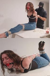 安·琳恩独自在家享受着宁静的夜晚,突然听到门开了。她以为丈夫提前回家了,便去查看,却发现空无一人。她觉得奇怪,正要走回厨房时,一个戴着面具的高大男子从背后抓住了她。绳索飞舞,很快她就被紧紧地绑在了厨房台面上。在被捆绑成猪蹄状之前,一个大号球形口塞被塞进了她的嘴里,让她口水直流。绑匪打了她几下屁股,然后才再次离开,让她独自享受这不再宁静的夜晚。Ann Lynn is enjoying a peaceful night alone at home when she hears the door open. When she goes to investigate, thinking her husband has come home early, she finds nobody there. Strange she thinks but as she walks back to the kitchen a large masked man grabs her from behind. The ropes start flying and soon she finds herself tightly tied up on the counter top. Before being put into a tight hogtie a large ballgag is stuffed into her mouth which induces her to heavily drool. Her captor spanks her a few times before eventually leaving her alone agian to enjoy her now not so peaceful evening.