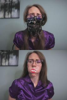 Her hands are tied in front of her this time and she has a thick panty gag, numerous strips of duct tape over her mouth and an over the nose face scarf is in place. Madalynn is FUMING MAD! So had she gag talks so hard her glasses start to fog.