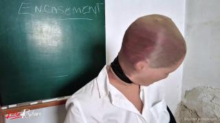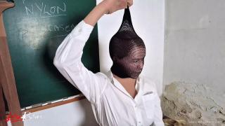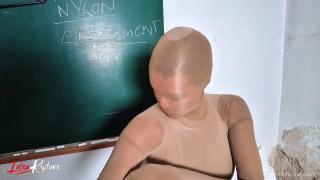 Since all female students in her nylon seminar must appear encased in nylon from head to toe, all participants are covered with at least two layers of nylon by the end of the lesson. At the end, the teacher explains how to pull a condom over her head. However, this is part of the next lesson.