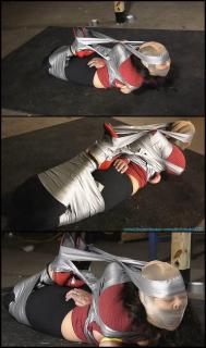 This clip starts where Part 1 ended... Summer's captor is not done with her just yet. He hogtapes her by running tape across her chest and then back to her feet, arching her as much as possible in the process. He then tapes her ankles to her thighs to make the bondage even more secure and tight. He leaves her once again. It doesn't take long before he is back though with a nylon stocking. He hoods poor Summer with it. It takes a while as it is a very tight fit! Once she is hooded, he wraps tape around her forehead and then back to her feet. Summer can barely move at all now. All she can do now is moan and twitch. After a while her captor rolls her on her side, because she sure can't do it herself. The rest of the clip is Summer struggling/twitching in her inescapable tight tape bondage