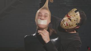 I step in close and pull a pair of pantyhose over her head, then begin wrapping her face and head with more duct tape, layer after layer, leaving only a small opening so she can breathe through her nose. Her world shrinks fast - vision gone, sound muffled, movement reduced to tiny, helpless shifts.