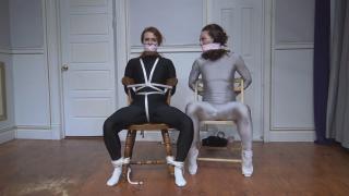 Chair Bondage scenario. Talia bound in chair for 20+ minutes. Tying occurs slowly and gradually over the course of approx 7 minutes. Both ladies wear spandex bodysuits and white ankle socks.