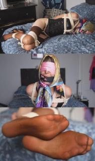 她酷爱丝绸和缎子。她一直在一个性癖网站上和一个男人调情,他们经常见面,但这次趁丈夫不在家,她邀请他来家里。他们回到她家,男人欲火焚身,一把抓住她,用手捂住她的嘴,然后把她带进卧室。男人也知道这位性感熟女喜欢捆绑。接下来,我们看到托尼被绳子绑在床上。她的缎面衬衫和皮裙都被脱掉了。现在她只穿着紧身胸衣、内裤、吊袜带、丝袜和高跟鞋。她还戴着缎面头巾。她在床上挣扎,扮演着楚楚可怜的少女,直到那个性癖约会对象走进房间。他拿着她的包,从中掏出一堆围巾。他拿了一条,紧紧地塞住托尼的嘴,让她无法说话。然后他拿出她的口红,用捂住嘴的手抹开,再涂上她的唇膏。男人随后离开,留下托妮独自在床上挣扎。这位性感的老奶奶无法挣脱,过了一会儿,男人又拿着她的几条围巾回来了。他用另外两条缎面围巾堵住她的嘴,让她更加安静。然后,他又用一条围巾蒙住她的眼睛,最后用另一条头巾把她裹得严严实实。他再次离开,留下托妮独自挣扎,对着口塞哭泣。托妮很喜欢扮演落难少女,喜欢被捆绑和包裹在缎子里。经过一番抚摸和挑逗后,约会对象取下了这位成熟女性嘴上的围巾。 she just loves silk and satin. She has been flirting with a man online from a kink site and tgey often meet up but this time she invites him over while her husband is away. They arrive back at her place and the man is so horny that he grabs her and hand gags her befire taking her into the bedroom. The man also knows the sexy gilf also loves bondage. We next see toni bound on the bed with rope. She has been stripped of her satin blouse and leather skirt. Now she is in her corset, knickers, garter, stocking and heels. She is also still wearing her satin head scarf. She struggles on the bed playing the damsel before the kinky date enters the room. Holding her bag he produces a bunch of her scarves. He takes one and gives toni a tight scarf cleave gag to keep her quiet. He then takes out her lipstick and tops her lips up after smudging it with his hand gag. The man then leaves toni to struggle on the bed again. The sexy grannie cant get loose and after a while the man returns again with more of her scarves. He then cleave gags her with another 2 of her satin scarves to keep her extra quiet. He then blindfolds her with another and finishes her off with another head scarf. Once again he leaves toni g to struggle against her bonds and cry into her gag. Toni just loves playing the damsel and being tied up and wrapped in satin. After some groping and teasing the date removes the mature womans scarf gags and