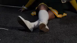 Marie takes her turn to be tickled. Tied to the sofa, she removes her socks and awaits her fate.