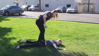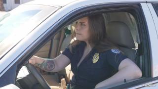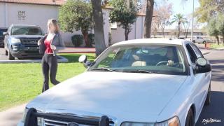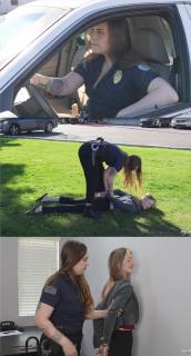 Officer Lo is on the lookout waiting for her perp when she sees her, Lexi Mode walking by. She immediately jumps out of the car and tells her to get on her knees in the grass. Lexi does so and she is pushed to the ground. Officer Lo informs her there is a warrant for her arrest and handcuffs her hands behind her back while reading her rights. She helps her stand up and buckles her in the back seat of her patrol car. Back at the station Lexi is taken from the car and Officer Lo frisks her before bringing her inside. Once inside she is left cuffed to the bench for a few minutes and when Officer Lo returns she is taken to a table and handcuffed to it where her processing begins. Her information is recorded as well as her fingerprints and she makes her one phone call before being removed and led away.