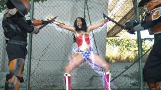 任務にしくじったダイナウーマンはいきなり大ピンチに陥り、凶悪な怪人達に責めまくられ、白目をむくくらい苦しんでいた。そして電気地獄で苦しみ、自白剤でアマゾニアン国の場所を尋問されるがダイナウーマンは仲間を売ることはしなかった。だが、自白剤の効果で悪の権化バイル将軍の穢れた男根を咽喉の奥まで咥えこまされ精液を注ぎこまれるのだった。もはやダイナウーマンは終わりかに思えたが千載一遇の大逆転のチャンスを掴むのだった!自分を弄った怪人達や将軍を怒りの力で倒すダイナウーマンだったが、悪の女神ダークウーマンが現れるのだった。ダークウーマンはダイナウーマンのDNAで造られたダイナウーマンとは真逆の悪の力で責め立てダイナウーマンはまた劣勢となり痛めつけられてしまい大ピンチとなる!そして再び性的襲撃の責めがはじまりダイナウーマンは結局大敗北してしまう・・・![BAD END]