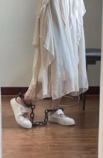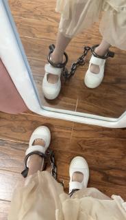 脚腕早就磨破了,还没恢复,看起来红红的,在公园长椅上锁好脚镣,在石头路上走走,这个公园是临街的,沉重的脚镣铁链声音比较大,又磨的脚腕又疼又痒,妹子时不时要调整一下镣环,后面走到草地上走路,然后到小路上散散步,摆拍一些照片,最后自己拿着手机对着脚录,展示细节和磨损。