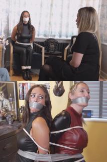 We find the girls struggling bound and gagged in Nettles’ study! Trussed and wrapped tape slapped over their mouths, our sneaky-snoopy little bitches are secured to their chairs looking like they don’t know quite what hit them as they struggle and squirm, clearly having a tough time with their sticky gags. But what can they do with their hands literally tied? As they regard one another with round eyes, unable to utter a word, the frantic babes squiggle, continually attempting to speak, as if they might understand a word of it. Their thoughts are clearly running rampant, uncertain of their fate up at this old place. Well, hey suppose they WERE warned…