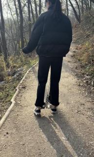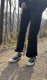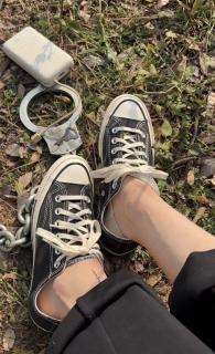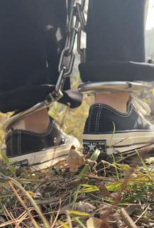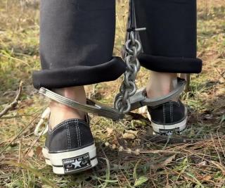 大家好,我就是视频里出镜的模特,目前在读大学。这天周末,摄影师指定让我穿着低帮匡威帆布鞋和小船袜 戴着一副1.5kg的不锈钢脚镣,后面换成一副60年代的古董脚镣,它更像是脚铐,但是有3斤重,真的是刑具,非常非常疼,超级硌脚后跟,再也不想戴了。贴了创可贴也没用,戴脚镣爬山超级超级累,超级超级磨脚,最后袜子都是湿的,脚镣链子也磨花了。