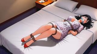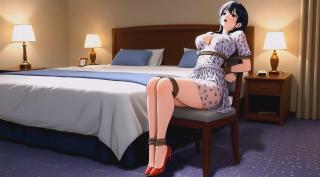 What was meant to be a romantic hotel getaway turns into an intensely thrilling adventure... My gorgeous wife, looking absolutely irresistible in her sheer floral dress that clings to her voluptuous curves, paired with those stunning red high heels, suddenly finds herself tightly bound on the king-size bed.