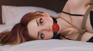 看着我慢慢地用柔软的绳子缠绕她美丽的身体,在她躺在床上时,将她的手腕、手臂和腿都绑了起来。绳子勾勒出她曼妙的曲线,她的脸颊泛红,呼吸也变得急促起来。