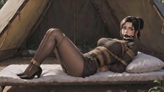 Before she can even reach the gold, he surprises her, overpowers her quickly, and binds her wrists behind her back with rough jungle rope. Dragged inside the tent, she is placed on the camp bed – helpless and struggling, her voluptuous curves straining against the tight coils wrapped around her arms, chest, waist, and legs.