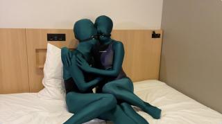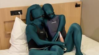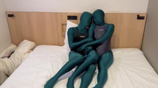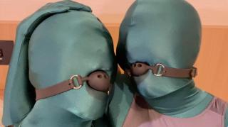 两个人穿着zentai,外套紧身连体泳衣,还带着口球。