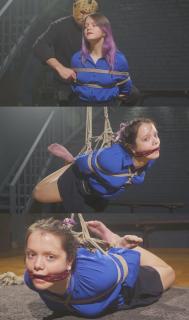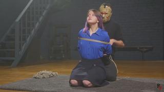 Her arms go behind her back into a tight box tie. A tight cleave gag silences her. I gather all her hair into a neat bundle with rope, then guide her down to the floor so the real part can begin.