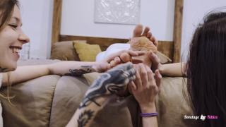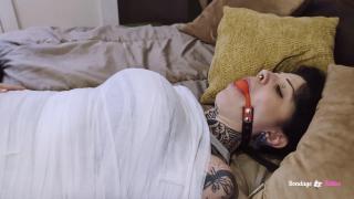 Teasing, Tickling, and Shared Control The teasing continues as Aly and Magia take turns playing with Dolly's feet, mixing light tickling and slow, deliberate touches. Dolly struggles within the tight tape, but the mummification keeps her firmly in place. Her muffled sounds through the gag only add to the intensity of the moment.