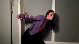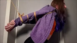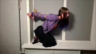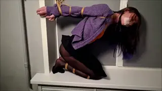 Bondage rope, elbows tied, tape gagged, kneeling, struggling,tall girl,pantyhose, suspended by wrists, moaning