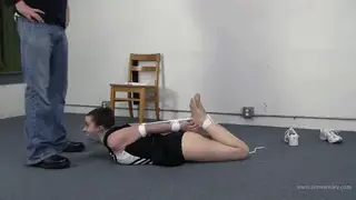 【中文seren】啦啦队员逃进一个房间,抓捕她的人占上风,把她捆绑起来,堵住嘴。最终,他把她放在一个XXXXer的怀里,以便抓住她,并有效地解开绳子,紧紧地缠绕在她的手腕上,约束她。最后,他占了上风,她的手腕被反绑在背后,反对她的抗议。他绑住她的手腕,迅速将她带回工作地点,然后将她的脚踝绑在一起,男人把沉重的靴子放在Serene的马尾上,把她紧紧地绑在一起。在她完全被束缚的情况下,男人脱下她的运动鞋,她的袜子把两双袜子都拿走,用她自己在啦啦队运动后汗流浃背的运动袜塞满了她的嘴。Serene is roughly XXXX into a room from cheerleading practice. Her captor grabs at her and wrestles her arms behind her back trying to gain the upper hand and get her bound and gagged. Eventually he gets her in a XXXXer hold in order to grab her and effectively get the rope untied and wrapped tightly around her wrists restraining her. Finally he gets the upper hand and her wrists are bound behind her back against her protests. With her wrists bound he executes a quick back trip and takes her down to the ground where he works and gets her ankles tied together next. XXXX over onto her stomach the man puts his heavy boot on Serene's pony tail holding her to the ground as he tightly binds her elbows together. With her completely bound the man then takes her sneakers off and her socks taking both of the socks and stuffing her mouth with her own sweaty post cheerleading workout socks. With her cheeks tightly packed the man takes silver tape and wraps it securely around her well packed mouth gagging her beyond effectively.