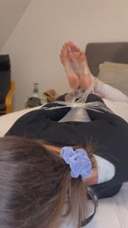 今天我被透明胶带捆绑,嘴里塞着球形口塞。我完美但略微脏兮兮的脚底完全暴露在外,之后还被绑在了一起。然后他舔舐我毫无防备的双脚。Today I'm bound with transparent tape and gagged with a ball gag. My perfect but slightly dirty soles are on full display and later tied together. He then licks my defenseless feet.