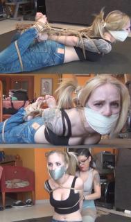 Trece in blue jeans rope tied up and gagged