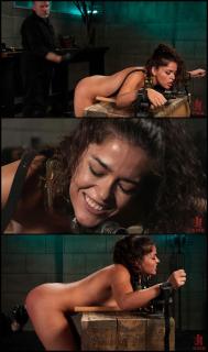 Next, Victoria finds herself bent over and shackled to a wooden box. Eli spanks her beautiful bottom, hits her with his flogger, and then bludgeons her with his baton. He slides a cold metal toy inside her pussy, makes her hold it there for ten seconds, and then rewards her with a vibrator and a huge orgasm.