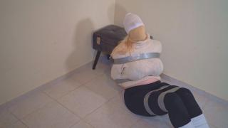 Victoria is now restrained with duct tape around her ankles, thighs and above her knees with her wrists behind her back and a pair of large thick white socks over her hands, she has a handkerchief stuffed in her mouth preventing her from shouting for help and a sack over her head makes it impossible to see where the creepy Janitor is. Victoria starts to struggle and manages to spit out the stuffed gag as she starts to call out for help the Janitor removes the sack that is over her head and stuffs two pairs of her panties in her mouth before wrapping tape around to secure them in place.