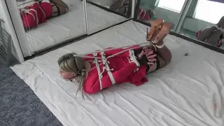 Nina is wearing a sexy short red dress and is again hogtied on the floor with mirrors all around so she can see herself while she try's to escape. After a while the attached wand is turned on to turn her on.