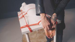 Since her feet are so sensitive, to continue, we have to tighten her bondage and tie her very tightly to the table with ropes. After this, we remove her socks and apply oil to her bare soles using a brush. Every brush stroke is very sensitive for her. We then continue the tickling with the brush, working quickly and thoroughly on her feet, leaving no area untouched. We continue the tickling, experimenting with special brushes, and then continue tickling with fingers.