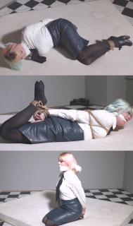 出事了。安珀是保安主管,可她现在却被绑了起来。她穿着标准的皮质铅笔裙、白色衬衫和黑色领带,被粗糙的绳子捆绑着,嘴里还塞着一块布。something has gone wrong. Amber is head of security, yet here she is all tied up. Wearing her standard issue leather pencil skirt, white blouse and black tie, she is tied with rough ropes and gagged hard with some cloth.