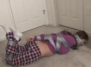 Ashlee calls her husband to tell him she is scare and for him to come home. When he refuses, she expresses her anger and tells him that one day he is going to come home to find her tied up and gagged with her pants down. She was almost right, because someone does come in, but instead of tying her up, he tapes her up.