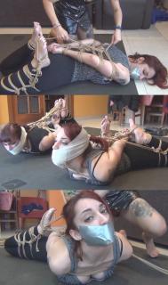 玛古特感觉糟透了,她背痛难忍,于是决定去看医生。镇上来了一位新医生,名叫莉莉卡。“哦,别担心,我们有一种新疗法,很快就能治好你的背痛!坐下吧。”玛古特坐了下来,她松了一口气,终于有人要帮她解决背痛的问题了。但就在这时,她看到一根绳子飞向她的右边。“这是什么?”几秒钟后,她的双手就被绑了起来,她根本来不及反应。“这就是我说的新疗法!”“什么?你疯了吗?”莉莉卡没再多说,用玛古特自己的袜子和胶带堵住了她的嘴。就在她绑玛古特的时候,有人按响了门铃。莉莉卡没想到会有人来,但她还是开了门。泰尔菲出现了。“你好,我可以进来吗?我需要一位医生,我背痛。”“当然可以!请进!”莉莉卡说道。泰尔菲走进屋里,看到玛古特被绑着,嘴也被堵住了,躺在地板上。“也许我晚点再来……”她试图逃跑,但莉莉卡从后面抓住了她。“不行,亲爱的,你也要和她一起接受这种新的‘酷炫’疗法!”泰尔菲也被绑了起来,嘴也被堵住了,用的还是她自己的袜子。莉莉卡把她们绑得非常紧!根本无法逃脱。这种疗法需要几个小时才能生效,所以莉莉卡把她们留在那里。在此之前,她用绷带把她们的嘴包了起来,确保她们无法说话。莉莉卡离开了,现在两个可怜的女孩被绑着,嘴也被堵住了,躺在地板上。挣扎是徒劳的,绳子勒得太紧了!Margout is feeling horrible, she's got back pain, so she's going to the doctor. A new doctor has arrived in town, she's Liricaa. "Oh don't worry, we have a new treatment that will cure you in no time! Sit down". Margout sits down, she's relieved that finally someone is gonna do something about her back pain. But then, she sees a rope flying at her right "What is this?". In a few seconds, her hands are tied up, she didn't have time to react. "It's the new treatment I was talking about!" "What? Are you crazy?". Enough talking, Liricaa gags Margout with her own socks and tape. While she's tying up Margout, someone rings the doorbell. Liricaa wasn't expecting anyone but she opens the door. Telfy appears "Hi, can I enter please? I need a doctor, I've got some back pain". "Sure! Come in!" says Liricaa. Telfy enters inside and sees Margout tied up and gagged on the floor " maybe I'll come later...." She tries to escape, but Liricaa grabs her from behind "No dear, you'll join her in this new awesome treatment!". Telfy is also tied up and gagged with her own socks. Liricaa ties them up really tight! Impossible to escape. The treatment needs some hours to be effective, so Liricaa is leaving them there. Before that, she puts some wrap around their mouths, to make sure they won't be able to talk. . Liricaa leaves and now the two poor girls are tied up and gagged on the floor. Struggling is useless, the ropes are so tight!
