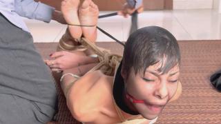 梅拉下班了,正准备回家。她的老板杰克对她过去一个月的表现很不满意,认为梅拉应该受到严厉的教训,以改变她的工作态度。他先用绳子把她绑在椅子上,用她自己的围巾堵住她的嘴,但看到她穿得太多了,就把她的衣服全部脱光,捆成一个紧紧的猪蹄状,看着她拼命挣扎。Mayla has finished her shift and is getting ready to go home. Her boss Jack is not very satisfied with her performance over the last month and thinks Mayla deserves a rather harsh lesson to change her attitude at work. He starts by tying her to a chair with ropes and gagging her with her own scarf, but seeing that she is wearing too many clothes, he strips her and puts her in a very tight hogtie and watches her struggle with all her strength.