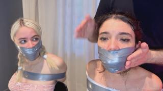 Nani blames the gagged Addy, “friend, you should fight the bad man and free me!” But Addy only responds MMMPPH. The intruder, with a huge cloth, begins stuffing it into Nani’s mouth to shut her up and wraps PVC tape around her head again and again until it’s tightly secured. He notices that Addy is also gagged, but she’s missing tape! He removes the cloth and applies PVC tape around her head too, hearing the friends moan MMPPPH.