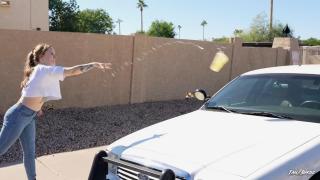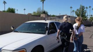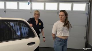 Officer Violet Pixie is taking some selfies in her patrol car when Lavender walks by and tosses her drink at the windshield and flips her off. Officer Violet quickly exits her car and catches up with Lavender, handcuffing her and placing her under arrest. She walks her back to her car and puts her in the back seat. Back at the station she frisks Lavender before bringing her inside. Once inside her cuffs are moved to the front and she is processed by Officer Violet. She then has her mugshots taken and she’s put in a set of transport cuffs. After she is properly handcuffed and shackled, Officer Violet locks her to the bench.