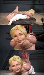 Hottie Cindy shows herself in hogtie on the turntable