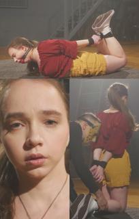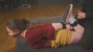 嘴里的布团依然牢牢地堵住了她的嘴——这个可爱的小俘虏只能发出含糊不清的声音、沉重的呼吸声,以及无助、绝望的气息。Arina has a challenge in this clip - to show all the struggling she can possibly give.