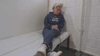 In privacy he removes her cuffs and tells her to remove her hoodie and shoes and socks. He cuffs her behind the back again and at the ankles. She moves slowly around the room while restrained and then tries to get comfy in a chair wondering what is going to happen. When he comes back he begins to tie her legs up with rope. She is happy that her pants are still on and her legs are tied together. Things could be much worse. He puts a ballgag between her teeth and then hogties her and then he gets to work licking and sucking on her toes while she is bound. She can’t believe that this is really happening. (Hogtie scene is about a half hour with footworship on and off. It starts at 27 minutes) Once he is done with her feet and watching her struggle he unties her. She puts her sweatshirt and shoes and socks back on. He puts her in some transport restraints with a leather belt and escorts her out. Lastly she is taken to a cell and left in restraints for the time being.
