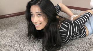 Bethany , lying on the floor in her casual clothes & white socks, is pretty confident that she would be able to free herself from a hogtie. When we return, she is hogtied and gagged with a blue ball gag, which slows down her cocky attitude.