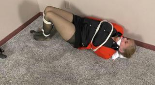 Returning home after a long day, Dianne is attacked in her own home by an intruder. Dressed in a black blouse & skirt and a red blazer, pantyhose, & heels, Dianne is cleave gagged and thoroughly bound and left on the floor to struggle.