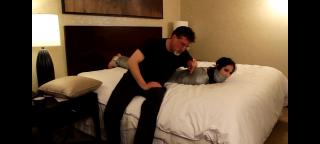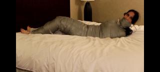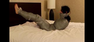 Raven keeps turning up the heat in a hotel room and I can't stand it any longer. If she can't stay warm then I can certainly help her out! First her hands are taped tightly to her sides and a pair of panties is stuffed into her mouth and sealed in place with duct tape. Next she's laid out on the bed and rolled up tightly in a nice warm heavy blanket. A few more wraps of duct tape make sure the blanket is not going to come lose or unravel and then it's time to really go to work! I wrap the blanket from shoulders to ankles completely in duct tape, sealing her in a nice hot cocoon! She's not happy about it at all and struggles and gag talks up a storm. I certainly won't be able to get any rest with all that noise, so I take a pair of socks and tape them in place over her already gagged mouth! She fights to make noise over the giant thick gag but there's no way anybody is going to hear her screams for help. I leave her to struggle on the bed and she does not disappoint! Thrashing, kicking, and rolling about, she tries to free herself but of course it's no use!